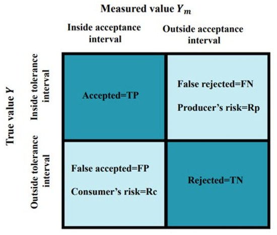 By introducing acceptance intervals, the concept of conformity assessment is extended to more general decision problems. In this case, four different outcomes are possible. Valid acceptance occurs when the measured value is within the acceptance interval and satisfies the specifications. Valid rejection occurs when the measured value is outside the tolerance interval and outside the acceptance interval. In terms of machine learning, valid acceptance is equivalent to the term true positive (TP), and the term valid rejection is equivalent to the term true negative (TN). If an item is accepted but does not conform to specifications, this is called false acceptance (FA). False acceptance probability refers to the global consumer’s risk. If the measurement result is rejected, although it conforms to a specification, this is a falsely rejected measurement (FR). The probability of this incorrect decision is called the global producer’s risk. In contrast to the specific risk related to a particular tested item, the global risk of producers and consumers refers to the risks calculated for a sample drawn from some statistical population of such items obtained in some production process [1].
