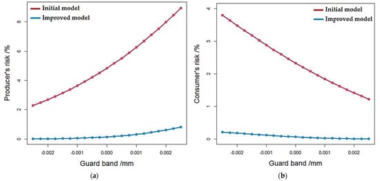 By comparison of the data from Table 2, it can be concluded that the most favorable situation for minimizing the producer’s risk for the initial model is at the point of change, as . Therefore, the optimal guard band for the initial model in the case of minimizing the global risk of the producer is equal to mm. In this case, the producer’s risk is the smallest and equal to but the consumer’s risk is the highest for all proposed lengths of the guard bands. The most favorable situation with the improved model is for Then, the producer’s and consumer’s global risk are the smallest and amount to Therefore, when minimizing the producer’s risk, in the improved model, it is optimal to set the length of the guard band to mm.