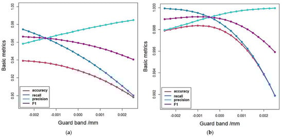 The values for the F1 score fall along the guard band axis in both the initial and improved models. The F1 score metric behaves in the same way as accuracy; only the values taken by F1 score are higher compared to accuracy. For the higher positive values of the guard band, accuracy drops faster in comparison with the F1 score. The maximum of the F1 score in the improved model is 0.9991976. The maximum is achieved for the same length of the guard band mm, and the same multiplier as well as with the accuracy metric. The fact that the F1 score is the harmonic mean of the precision and recall metric is clearly visible in Figure 7. F1 is symmetrically placed between precision and recall. Deviations from symmetry are, at most, of the order of magnitude in the initial model, and the order of magnitude in the improved model.