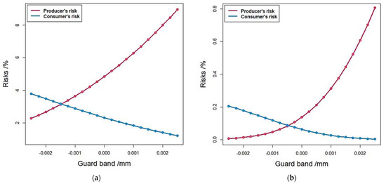 Unlike the specific risk, the global risks have different values for the different lengths of the guard band. The global producer’s risk is the lowest in the case when the length of the guard band is mm, and the highest if it is mm (Figure 6a). For the global consumer’s risk, the opposite is true (Figure 6b).