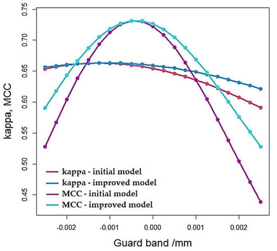 It is obtained numerically that, in both the initial and improved model, kappa and MCC curves reach their maximum for As with precision, recall, and F1 metrics, when it is also worth that is The maximums are achieved for the negative values of the guard band, i.e., for the model of minimization of the global producer’s risk. For the initial model, the maximum value is for the length of guard band mm, and for With the improved model, the maximum is reached for mm and , and it has a value of Values of these statistics in the range of 0.61–0.80 indicate a moderate level of agreement between actual and predicted results [34].
