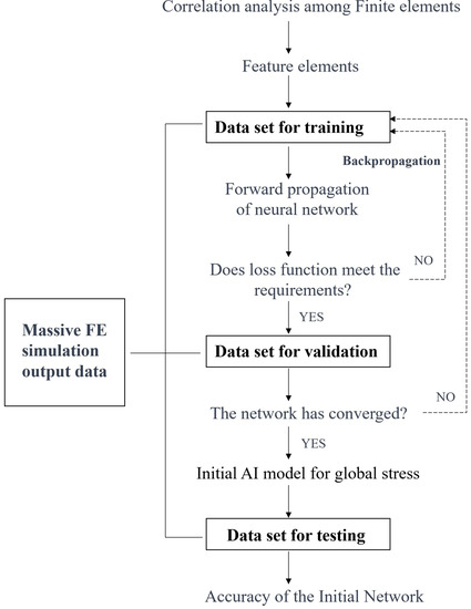 All the finite element stress data for all load cases are used as sample data, and they are randomly divided into training sets (2400 cases), validation sets (600 cases), and test sets (600 cases). These data from the simulation will be utilized to build the initial ANN for global stress.