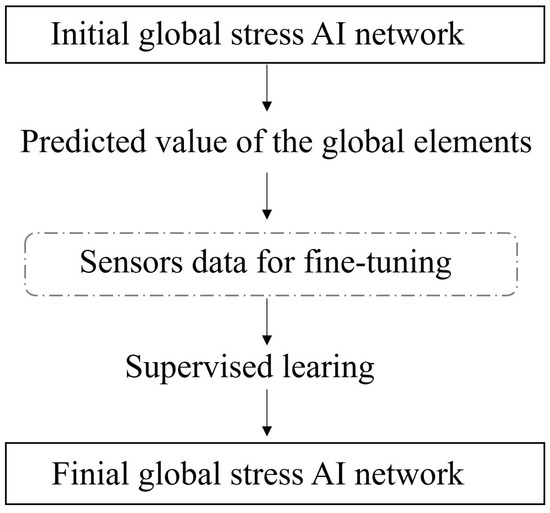 Figure 2 illustrates the process of fine-tuning the ANN trained by simulation data (initial network). To fine-tune the initial network for deployment to physical structures, measurement points are randomly selected from areas of high stress. The actual sensor data are compared to the predicted values of the initial network, and a fine-tuning matrix is added outside the output layer of the network through supervised learning. This process creates the final artificial intelligence network (referred to as the “final network”) that can be deployed to physical structures.