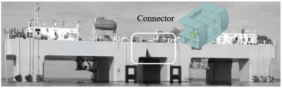 The THAFTS (version 2.0) software was utilized for the three-dimensional hydroelastic analysis, determining the connector’s response amplitude operator and short-term extreme profile loads [25]. The analysis revealed that the connector experienced primarily longitudinal and vertical forces, with lateral compression as a secondary loading mode. Wave direction greatly influenced the connector load, with oblique waves resulting in the highest loads. The study considered a connector load range of 0 to 2630 kN within the plane, representing the primary loading mode [26,27].