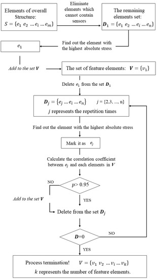- The finite element with the highest absolute stress value in D is chosen as the feature element . Subsequently, the correlation coefficient between and other elements is sequentially calculated, where , and j represents the repetition times. Based on Equations (4) to (8), the correlation matrix P of the finite element is obtained. If , is added to the set V.