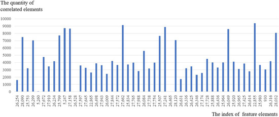 The 50 feature elements were sorted in descending order according to their stress amplitudes, and the number of correlated elements for each feature element was counted, as shown in Figure 8. The results showed that the number of finite elements that had a correlation with the 50 feature elements was 220,905, exceeding the total number of entire elements, which was 30,858. This indicates that there are multiple intersections among the 50 subsets, and fewer feature units can be used to obtain the full-field stress distribution.