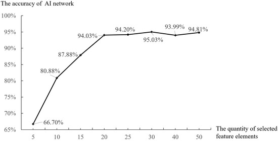 Subsequently, a neural network was trained for global stress by selecting 5, 10, 15, 20, 25, 30, 40, and 50 feature elements in descending order of their stress amplitude as input variables. The influence of different numbers of feature elements on the accuracy of the global stress solutions was analyzed, and the results are shown in Figure 9. It was observed that as the number of feature elements gradually increased, the calculation accuracy also improved, and the algorithm’s accuracy was found to be stable when the number of selected feature elements was 20. This indicates that most of the finite elements in the connector structure are strongly correlated with the first 20 feature elements, and the global stress of the connector can be accurately obtained using these 20 feature elements.