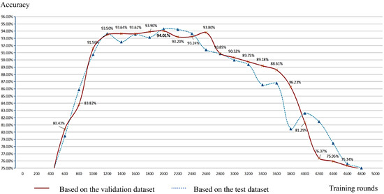 When predicting a large number of output variables with only a small number of input variables, overfitting can occur during the training process of neural networks. Overfitting can cause a decrease in the prediction accuracy of the neural network. Figure 10 shows the curve obtained when training a global stress neural network using the BP neural network without setting a convergence judgment. The horizontal axis represents the training rounds, and the vertical axis represents the accuracy. The blue curve represents the accuracy verified by the validation set every 200 rounds of training, while the red curve represents the accuracy evaluated by the test set every 200 rounds of training.
