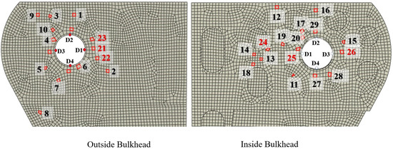 Static strain gauges and a total of 29 three-dimensional stress sensors were utilized for the test, as depicted in Figure 12. The sensors numbered 1 to 20 were utilized for training and were strategically positioned at feature elements to provide input data for the ANN. Sensors numbered 21 to 26 were strategically placed in high-stress areas of the outer and intermediate bulkheads to fine-tune the ANN. Lastly, sensors numbered 27 to 29 were used for verification purposes and were placed in arbitrary positions within the high-stress area.