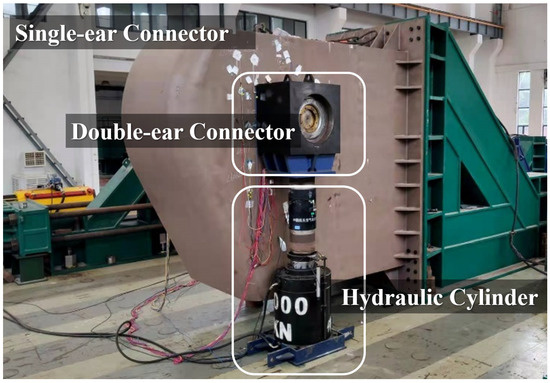 A fixture was utilized to simulate the adjacent double-ear connector, while a hydraulic cylinder was used to apply simulated shear forces. Precise control of the shear force was achieved using a force sensor, with the inclined angle simulated by fixing a bottom block to the cylinder, as shown in Figure 13 and Figure 14. The test was conducted within the elastic ranges, and the loading scheme is presented in Table 3. During the fine-tuning phase, the load conditions were distinct from those used for accuracy verification. A total of eight loading experiments were conducted at various angles. Among them, an angle of 13.3 was randomly selected as a test condition, and the corresponding measured data were excluded from the training process. Instead, they were specifically employed to evaluate the accuracy of the ANN in predicting global stress.