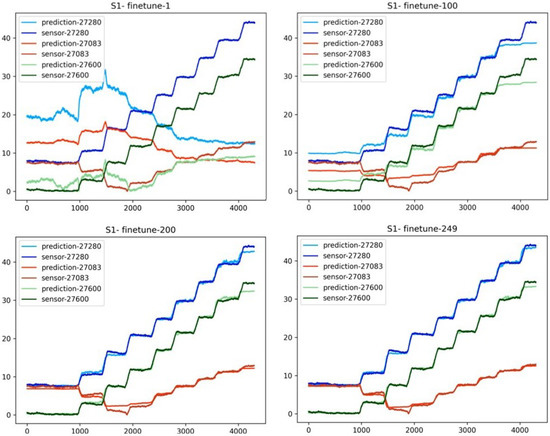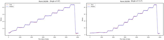- Figure 15 illustrates the process of fine-tuning a neural network at a loading angle of 10. The horizontal axis represents the experimental time steps, and the vertical axis represents the measured stress values. The neural network generates the stress data for three randomly selected validation elements; after 249 rounds of fine-tuning, the neural network can accurately predict the stress value.