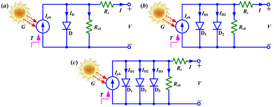 As can be seen from Figure 1, a real solar cell is modeled by the equivalent circuits comprising of a photocurrent source Iph, a lumped series resistance Rs, a lumped shunt resistance Rsh and one or several parallel diodes with different ideality factors. In Figure 1a, the diode D of SDM incorporates a nonphysical ideality factor n to account for the combined effect of more than one type of conduction mechanism within the actual solar cell. In Figure 1b, the first diode D1 represents the conduction phenomena in quasi-neutral regions, while the second diode D2 corresponds to the recombination in the space–charge region of the junction. In Figure 1c, the first two diodes D1 and D2 of TDM carry the same physical meaning as they did in DDM, while D3 is exclusively designed to take the recombination losses in defect regions and grain boundaries into account with the ideality factor n3. For a given irradiance and temperature, the I–V relationships in Figure 1a–c can be formulated by the SDM Equation (1), DDM Equation (2) and TDM Equation (3), respectively.