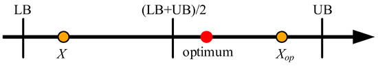 For each iteration loop, firstly, the min-max normalization is employed to convert different data features into the same scales, as in lines 11–16 of Algorithm 1. Since the model parameter values in initial point X have different orders of magnitude, they are normalized to the unitary surrogate Xu with Equation (31). It is evident from Equation (31) that the boundaries LB and UB can be mapped with lb = zeros(dim,1) and ub = ones(dim, 1), respectively. Then X, LB and UB are replaced with their unitary surrogates Xu, lb and ub to update the distances to the normalized boundary using Equation (20) or the definev function of MATLAB.