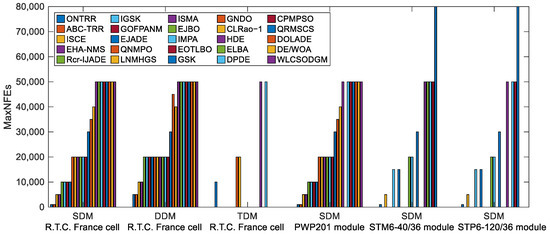 The optimal results extracted from the IEF-based objective function by the proposed ONTRR are summarized in Table 2. To ensure that the reader can reproduce the RMSE values, the parameter values in Table 2 are correct to 8 decimal places and compared to the results of some state-of-the-art algorithms, such as EJBO [5], GSK [6], GNDO [7], CLRao−1 [8], IGSK [9], IMPA [10], EOTLBO [11], ELBA [12], QRMSCS [13], MIGTO [14], CPMPSO [15], GOFANM [16], WLCSODGM [17], ISCE [18], DOLADE [19], Rcr-IJADE [20], DPDE [21], HDE [22], EJADE [23], ISMA [24], DE/WOA [25], QNMPO [26], LNMHGS [27], EHA-NMS [28] and ABC-TRR [29]. By crosschecking Table 2 and the results in [5,6,7,8,9,10,11,12,13,14,15,16,17,18,19,20,21,22,23,24,25,26,27,28,29], one can find that there is a less than 0.01 percent differences between them, even though they include different numbers of decimal places. This means that the proposed ONTRR possesses identical accuracy to the compared algorithms. However, considering the consumed number of function evaluations (NFEs), it is evident from Figure 4 that only ONTRR and ABC-TRR always take the least NFEs to achieve the optimal RMSE values among all compared algorithms. This suggests that these two algorithms need the least computational effort to reach the same accuracy, thereby having the highest computational efficiency for parameter extraction of the IEF-based SDM, DDM and TDM, followed by the ISCE [18], EHA-NMS [28] and Rcr-IJADE [20] algorithms.