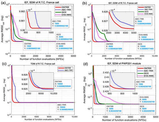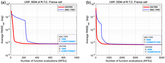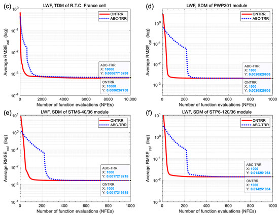 Figure 7 illustrates the average convergence curves of 1000 independent runs of the ONTRR and ABC-TRR algorithms during the parameter extraction process of the LWF-based objective function. For all the six cases in Figure 7a–f, the average convergence curves of ONTRR consistently lie to the lower left of those of ABC-TRR, and the final average RMSE values of ONTRR are less than or equal to those of ABC-TRR. This confirms that the proposed ONTRR algorithm converges faster than ABC-TRR for solving the LWF-based parameter extraction problem of SDM, DDM and TDM.