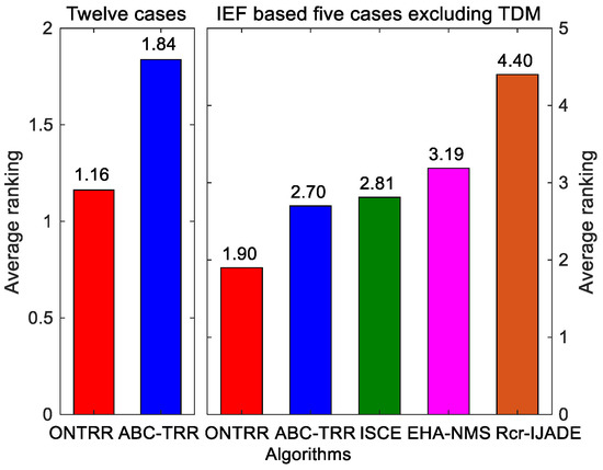 For all twelve of the cases in Table 4 and Table 5, a Friedman test with a confidence of 0.05 is used to evaluate the overall performances of the five compared algorithms. The Friedman test ranks each indicator and then gives the average rank of each algorithm. It is clear from the left of Figure 8 that the average rank of ONTRR is better than that of ABC-TRR. For the five IEF-based cases excluding TDM, it is evident from the right of Figure 8 that ONTRR still ranks the best on average, followed by ABC-TRR, ISCE, EHA-NMS and Rcr-IJADE. These results confirm that the proposed ONTRR outperforms other algorithms in extracting the most accurate parameter values of IEF- and LWF-based solar cell models.