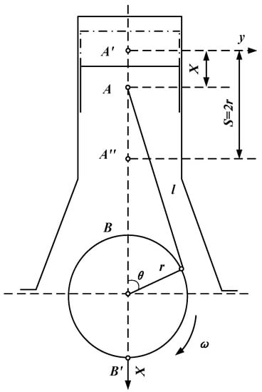 From Equation (2), only second-order steps exist, and thus, the calculated inertial forces can only go to the second order. If higher-order inertia forces are to be calculated numerically, more higher-order terms should be retained. The linkage combines the rotational motion of the crank and the reciprocating motion of the piston and oscillates reciprocally in the plane, and the angular displacement , velocity , and acceleration of the barycenter can be expressed as follows: