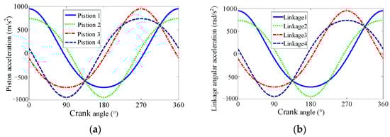 Based on the kinematic relationship of the crank linkage, r = 35 mm, λ = 25/280, and ω = 1480 r/min are substituted into Equations (2) and (3). The phases of one, two, three, and four cylinders differ by 180°, 270°, and 90°, respectively, and the piston acceleration curve and linkage angular acceleration curve are obtained as shown in Figure 3. The acceleration change trend of the opposed two piston columns is the same, and there is some difference in the values. The acceleration curve of a single piston is different from a simple sinusoidal law curve. The acceleration maxima in positive and negative directions are not equal. In one rotation period of the crankshaft, there are two moments when the acceleration of all four pistons is equal and four moments when the acceleration of the opposed two pistons is equal. Moreover, the angular acceleration of the linkage is symmetrical about the equilibrium position, and the acceleration phase is consistent with the geometric phase relationship of each column of the cylinder.