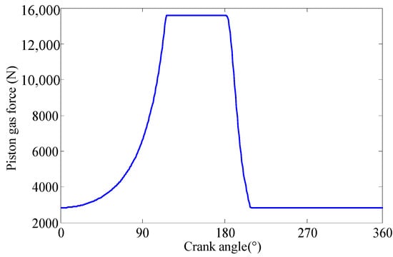 The crank angles of compression, exhaust, expansion, and suction are 0~97°, 97~180°, 180~295°, and 295~360°, respectively. Check the relevant standards [] and take MPa, , , and . Based on the gas pressure and the area of the piston of one cylinder, the variation curve of the gas force on the piston with the crank angle under ideal conditions is calculated as shown in Figure 4. The piston starts to compress the gas at 0°. Compressed to a certain extent, the exhaust valve opens under the action of differential pressure. Currently, the gas force on the piston remains unchanged, and the piston continues to move toward the cylinder head. When the piston approaches the apex, the exhaust valve closes under the action of differential pressure, the piston moves down, and the gas force drops sharply. As there is high-pressure gas in the remaining clearance volume, the inlet valve opens slightly later. After the inlet valve is opened, the air compressor starts to feed gas, and the gas force on the piston remains unchanged until it enters the next cycle of the compression process.