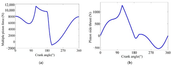 Variation curve of piston force with crank angle. (a) Variation of multiple piston force with crank angle. (b) Variation of piston side thrust with crank angle.
