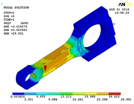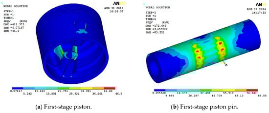 As it is necessary to ensure equal masses of pistons at all levels as much as possible, and the bore of the first-stage cylinder is larger, the static strength is calibrated for the first-stage piston and the second-stage linkage assembly according to the load-bearing capacity of the material and the calculated multiple piston force []. First, the 3D solid model is simplified by ignoring features such as chamfers and oil holes. Then, the mesh is divided for the calibration object, and material properties and boundary conditions are also defined to constrain the radial motion of the piston, and the round hole of the big end of the linkage is completely fixed. The piston end is loaded with the maximum value of the multiple piston force, as shown in Figure 5a. The stress distribution nephogram of each component is obtained, as shown in Figure 6, Figure 7 and Figure 8. The contact force area between the needle roller bearing and the primary piston pin is small, and the stress amplitude at the location where the two are in contact is large. The large-diameter first-stage piston is made of aluminum due to the demand for a lightweight piston. The strength is ensured mainly by internal gussets. The location where the gussets are connected to the pin bore is prone to stress concentration. The tension–compression stress will exist cyclically during the operation of the linkage. It is necessary to pay attention to the stress concentration in the transition fillet of the linkage body.