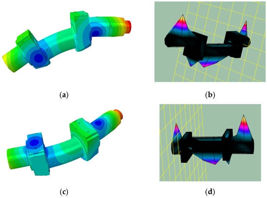 Comparison of modal vibration shapes of crankshaft. (a) Finite element first-order vibration shapes (1336 Hz). (b) Experimental first-order vibration shapes (1356 Hz). (c) Finite element second-order vibration shapes (1461 Hz). (d) Experimental second-order vibration shapes (1489 Hz).