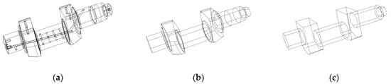 Simplified process of crankshaft. (a) Original 1:1 model. (b) Removal of round holes and chamfering model. (c) Peripheral detail modification model.