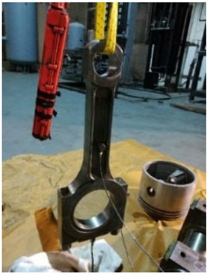 Modal analysis includes free modal analysis, installed modal analysis, and operational modal analysis. Free modal analysis is usually used to verify the reasonableness of the finite element model. It is the basis for further finite element analysis. In this paper, the free modal analysis of the crankshaft is carried out. The free mode of the crankshaft is measured by multi-point knocking and single-point response. Figure 9 shows the crankshaft free-suspension state. There are two hooking bolt mounting holes on the end face of the crankshaft, and the motorcycle elastic band is used to lift it with the hooking bolt. Figure 10 shows the knock point and acceleration sensor arrangement. The arrows show the sensor mounting direction. The black dot hammer indicates the hammering point and direction, and a total of 27 points are hammered. Each point is struck three times. The number of strikes must be recalculated in case of consecutive hits. Therefore, the hammering method requires some operational experience. In the finite element free modal analysis, the material properties are defined as follows: density is 7820 kg/m3, modulus of elasticity is 2.1 × 1011 N/m3, and Poisson’s ratio is . The mesh is divided into tetrahedral elements. The mesh is refined at the rounded corners and round holes. The number of mesh nodes is 195,652, and the number of divided cells is 136,554. In addition, 10 Hz–2000 Hz is chosen as the analysis bandwidth. The comparison of the modal vibration patterns is shown in Figure 11. In the frequency band of 10–2000 Hz, the crankshaft has only two bending modes. The bending directions of the modes can be aligned. The first-order resonance frequency is 1.5% different. The second-order resonance frequency difference is 1.9%. The error is controlled within 2% due to the influence of casting process and the lubricating oil left in the oil hole, which can meet the calculation requirements.