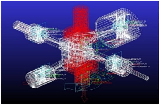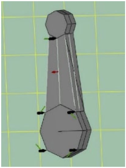 The linkage is freely suspended, as shown in Figure 13. First, we hang the small end of the linkage freely by the elastic rope, then tighten the linkage bolt at the large end of the linkage. The test bandwidth is 10–2000 Hz. It also adopts the method of multi-point knocking and single-point response, and the schematic diagram of hammering and response points is shown in Figure 14.