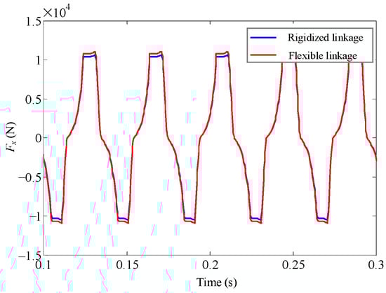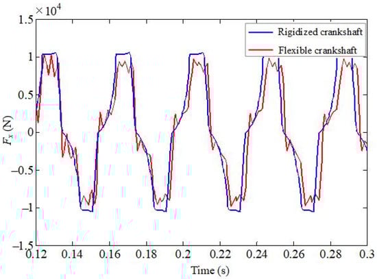 Tetrahedral elements are used to flex the crankshaft and linkage, respectively. The crankshaft is divided into 3574 elements. The primary and secondary linkages are divided into 980 elements. The third- and fourth-stage linkages are divided into 1056 elements. The crankshaft alone is flexible enough to obtain the main shaft force bearing situation, as shown in Figure 17. The four linkages are flexed separately to obtain the main shaft force bearing situation, as shown in Figure 18. From the comparison of the two figures, when the crankshaft is flexible, the main shaft bearing force fluctuates to a certain extent. When the linkage is flexible, the main shaft bearing force only increases slightly in magnitude, which means that the crankshaft is closer to the flexible body than the linkage. In general, neither the crankshaft flexibilization nor the linkage flexibilization changes the trend of the excitation force of the main shaft bearing. It is only the magnitude that deviates to some extent. The crankshaft flexibility is generally considered only in multi-row reciprocating compressors. The crankshaft stiffness of the four-star-type air compressor is large, and the rigid-body dynamics analysis that can meet the general calculation requirements.
