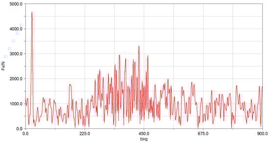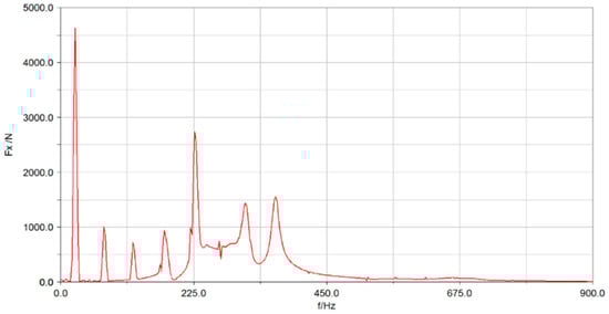 The rotational speed of the crankshaft is set to a constant value. The radii of the big end of the first-stage linkage are enlarged by 0.10 mm, 0.15 mm, and 0.20 mm, respectively, and the other kinematic pairs are set to the ideal connection. The excitation force in the X direction of the main shaft bearing is shown in Figure 26. Compared with Figure 22b, the presence of clearance makes the excitation force show the characteristics of broad frequency excitation, and the amplitude is nearly twice the ideal condition. The larger the clearance, the larger the corresponding excitation force amplitude. At the same time, the excitation force amplitude is located at different frequency values. It is because of the frequency-shifting characteristics of the excitation force amplitude in the clearance state, which makes the balance of the main shaft bearing excitation force in the clearance state very difficult, and the size and location of the clearance is also difficult to determine clearly. At present, the balance of the main shaft bearing excitation force is calculated based on the ideal kinematic pair connection.