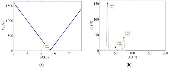 In order to facilitate the adjustment of the clearance values, the four-star-type crank-linkage structure was simplified. The simplified model is shown in Figure 21. The variation of the main shaft bearing force with the balance mass is shown in Figure 22a. The frequency domain diagram of the force applied to the crankshaft rotating pair in the direction of piston motion with the optimum amount of balance mass obtained is shown in Figure 22b. The simplification process brings about a change in the volume of the structure and the position of the barycenter. To some extent, the second-order inertia forces are excited, but they are still lower than the third-order inertia forces. The air compressor development process also cannot avoid the problem of center of gravity and mass deviation due to the non-uniform density of the casting.