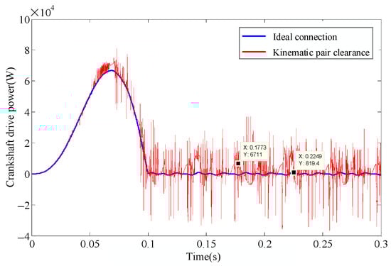 The simulation process directly constrains the rotational speed to a constant value so that the driving torque will change. The operating condition is 1480 r/min. The clearance between the crankshaft and first-stage linkage is set to 0.1 mm. The speed is set to the rated value within 0.1 s by using the step function. The drive torque power in the ideal connection and clearance kinematic pair state is obtained, as shown in Figure 23. The shorter the start-up time, the larger the start-up torque required. In 0.1 s, the required starting torque is larger, and the driving power is gradually stabilized after starting. In the ideal state, the final value of torque power amplitude is stable at 819 w. When there are clearances and friction in the kinematic pair, the power of the torque fluctuates transiently, far beyond the ideal connection. The torque power amplitude is at 6711 w without considering the transient fluctuation due to the balancing effect of the flywheel.