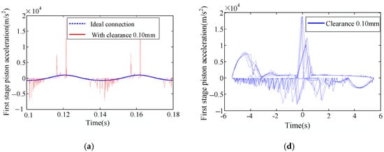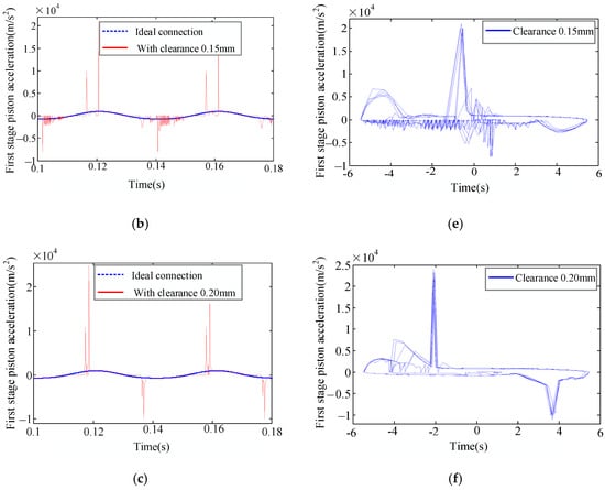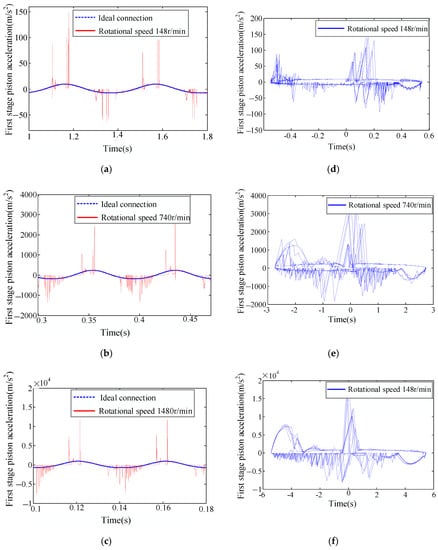The clearance value is 0.1 mm, and the speed conditions are set to 148 r/min, 740 r/min, and 1480 r/min. The time-domain accelerations at different rotational speeds are shown in Figure 25a–c. The higher the rotational speed, the higher the frequency of contact collision. It shows high-frequency oscillation, and the corresponding acceleration amplitude is larger. Since the time-domain acceleration is not symmetrical about the horizontal line with vertical coordinate 0, the positive acceleration is slightly higher than the negative acceleration. Thus, the peak positive acceleration is higher than the negative one, but the number of collisions is lower than the negative one. The acceleration-velocity phase diagram of the first-stage piston at different rotational speeds is shown in Figure 25d–f. The higher the rotational speed, the larger the amplitude of the phase diagram trajectory, and the more concentrated the phase trajectory.