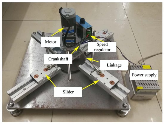 The test bench of four-star-type crank linkage is shown in Figure 28. The test system can be divided into four parts: one is the bracket part, mainly for erecting motors and linear guides of different heights. The second is the star crank-slider mechanism, which is mainly designed for the clearance size and position. Third is the motor and speed regulator, mainly including the selection of the motor and speed regulation scheme. Fourth is the test data acquisition part using the acceleration sensor to obtain the acceleration of the corresponding measurement points in real time.