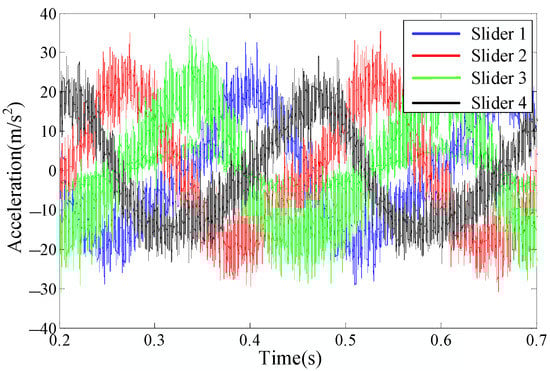The rated speed output of the purchased motor is 600 r/min. The output speed at full load with load is only 240 r/min. The acceleration of the four sliders at full load under normal installation is shown in Figure 30. As the test bench was built manually, threaded connections were used in many places, and no professional instruments were used for local adjustments, for example, alignment and leveling. From the figure, it can be found that the acceleration signal has serious distortion in the time domain. Therefore, this section focuses on the phase diagram to compare the test results and analyze the vibration acceleration of the bench.