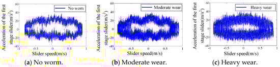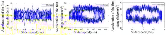 Considering the existence of mounting clearance in the test bench itself, the installation state of the first-stage linkage fisheye bearing without wear is taken as a reference. The acceleration–velocity phase diagrams of the first-stage slider at different rotational speeds under 80 r/min, 160 r/min, and 240 r/min working conditions are shown in Figure 32. As can be seen from the figure, the phase diagram trajectory is relatively turbulent at low rotational speed. As the rotational speed increases, the phase trajectory becomes more and more concentrated. The increase of rotational speed increases the slider acceleration amplitude and reduces the chaos of the system.