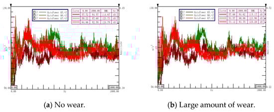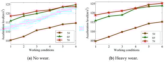 Comparing the two cases of no wear and big wear, the existence of clearance will increase the vibration of the bench. The increments of vibration acceleration levels at measurement points 5, 6, and 7 are 0.50 dB, 0.13 dB, and 0.42 dB, respectively. The acceleration increase of the base plate is obvious, mainly because the flywheel is installed near the base plate. In addition, the bearing mounting hole of the base plate has a certain clearance, while the other end of the crankshaft is directly connected to the motor output shaft, and the restraint is more solid. The presence of the clearance mainly affects the horizontal movement of the slider; thus, there is a 0.42 dB increment in the horizontal vibration acceleration level of the upper plate.