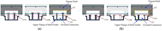 In concrete mechanics, interface shear transfer in reinforced concrete is probably one of the most important properties to be studied. Shear forces are transferred across an interface in many practical situations. Some typical examples of shear transfer interfaces are a potential or existing crack in a corbel, a cold joint in the shear wall, and an interface between a precast girder and cast-in-place deck in bridges. Recently, innovative off-site constructions utilizing prefabricated bridge elements have been continuously developed. The full-depth deck panel system is a typical system. In recent studies [,,], prefabricated composite girders with precast deck panels connected to the steel girders by injecting conventional grout into a continuous channel above the steel girders have been proposed. The performance of prefabricated composite girders with such injection channel connections is greatly influenced by the details and design of connections. The design of the injection channel connection is complicated with three different types of critical interfaces including the interface shear of monolithic grout (1) (consisting of (1A), (1B), and (1C)), interface shear between the precast deck and the field-cast haunch (2), and interface shear between the steel beam and the field-cast haunch (3), as indicated in Figure 1.