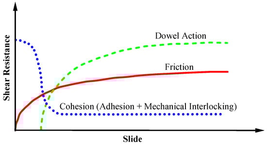 The shear friction theory assumes that when shear and compression forces act on concrete-to-concrete interfaces, the main load transfer mechanism is friction. The shear resistance is generated by surface roughness and a relative slippage between two concrete surfaces. A normal displacement and tensile stresses in the reinforcement crossing the interface are generated which grow clamping stress and lead to slippage resistance. From Figure 2, the normal displacement grows with the increase in slippage, and this displacement causes the yield tension of the reinforcement, which corresponds to shear resistance. After the shear friction theory was proposed, many researchers introduced different terms to develop the shear friction theory. In 1972, an equation named ‘‘modified shear friction theory” was proposed by Mattock and Hawkins [,]. In this equation, besides the friction mechanism related to surface roughness and clamping stress, the cohesion mechanism was also considered for the first time. Mattock et al. carried out many studies on interface shear resistance [,,,]. Then, equations were attempted to be adopted by many researchers. In 1997, a remarkable development in the design equations for shear resistance of concrete interfaces was proposed by Randl []. Randl considered the interface shear resistance including three load transfer mechanisms: (1) cohesion related to adhesion and aggregate interlock, (2) friction caused by surface roughness and clamping stress and/or externally applied loads, and (3) dowel action due to the deformation of the shear reinforcement. Then, to simplify Randl’s equation, other researchers suggested an equation neglecting the dowel action and considering the dowel action influence as a portion of the clamping stress []. In 2000, Zilch and Reinecke [] analyzed the three different load transfer mechanisms in more detail by establishing the relationship between slippage and interface shear resistance, as indicated in Figure 3. First, cohesion activates after small interface slippage caused by the loss of adhesion; then, it declines quickly with the increase in slippage. Second, friction is related to external loads perpendicular to the interface and clamping influence due to tension force when using shear reinforcement. Lastly, dowel action occurs after cohesion is broken.