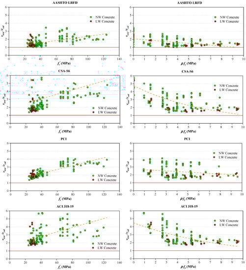 Monolithic precracked: The ACI 318-19 strength predictions were conservative at all clamping stresses and compressive strengths of concrete. The predictions of the CSA-S6 and PCI provided some vtest/vcal values less than 1.0. Figure 6 illustrates that for these two codes, values less than 1.0 occur for specimens made with lightweight concrete and for low clamping stress. Although the AASHTO LRFD again tended to be more accurate than other codes, the AASHTO LRFD strength estimates were unconservative.
