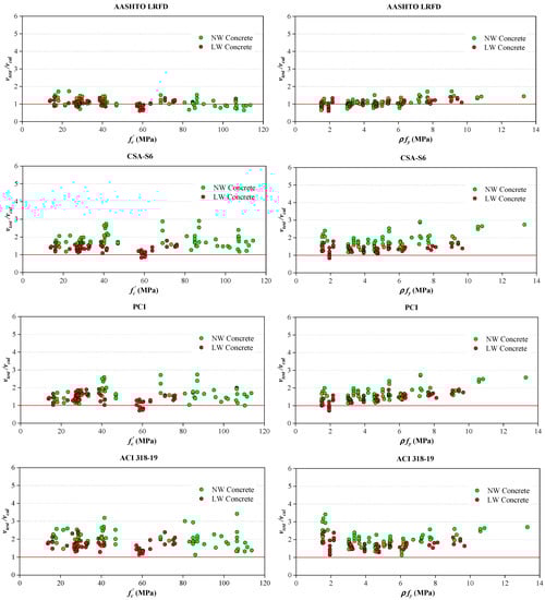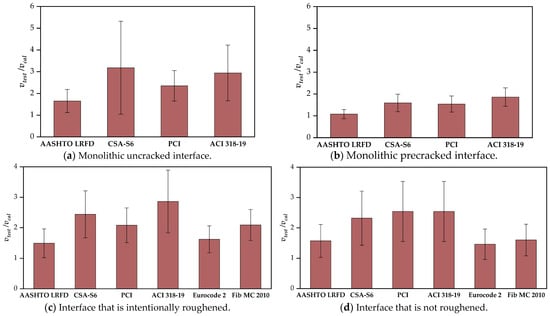 In this section, the interface shear resistance according to design codes is evaluated based on the test results in the database summarized in Section 3. The design provisions considered include six major international codes, namely, ACI 318-19; PCI Design Handbook; AASHTO LRFD; CSA-S6; Eurocode 2; and Fib Model Code 2010.