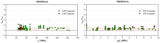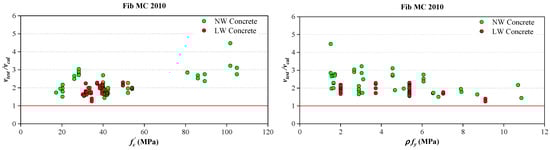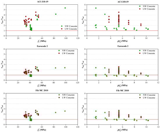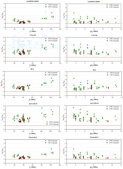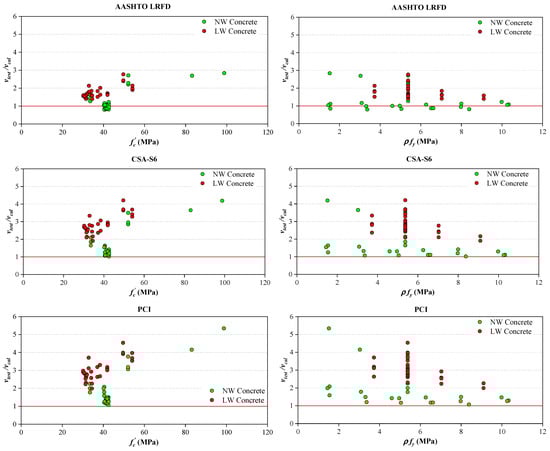 From the calculation results listed in the Appendix A, ratios vtest/vcal are plotted against the compressive strength of concrete fc′ and the clamping stress of shear reinforcement ρfy, as shown in Figure 5, Figure 6, Figure 7 and Figure 8. The vertical axis of each graph ranges from 0 to 6.0 for each of the six design provisions evaluated. Ratios vtest/vcal greater than 6.0 are not indicated in the graphs, but they are listed in the Appendix A. These figures are plotted to compare the peak measured shear stress vtest with the interface shear resistance vcal calculated utilizing equations from codes for specimens with different interface types (M-U, M-P, J-R, J-M) and different concrete types (NW, SLW, ALW).