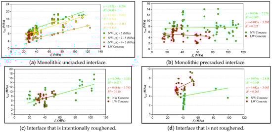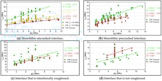 Figure 11 illustrates the peak measured shear stress as a function of the compressive strength of concrete fc′ for all four interface types. In each interface type, the peak measured shear stress is grouped by concrete type. Moreover, for the monolithic uncracked interface, the peak measured shear stress is further grouped by the clamping stress. Although the clamping stress is the core factor influencing the interface shear resistance, the compressive strength of concrete played a crucial role as well. This section presents the effect of this parameter on the shear resistance for different interface conditions. The interface shear resistance generally increased with the growth in compressive strength of concrete fc′ for monolithic uncracked specimens. For monolithic precracked specimens, the compressive strength of concrete fc′ did not appear to influence the interface shear resistance. The interface shear resistance tended to rise with growing compressive strength of concrete fc′ for cold joints that were intentionally roughened. The higher shear resistance was recorded for specimens that utilized high-strength concrete. For the interface shear resistance of cold joints that were not roughened, no appropriate trends were seen with respect to the effect of the compressive strength of concrete fc′.