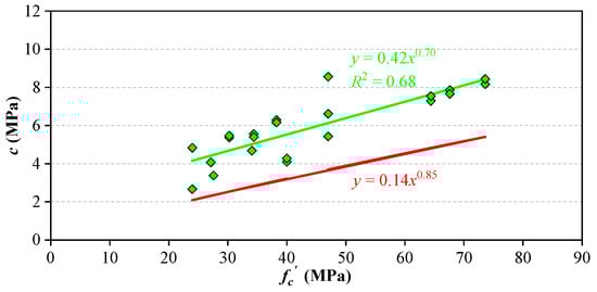 First, the experimental results with ρfy = 0 are chosen to determine cohesion c (these results are highlighted in the gray background in the Appendix A). Now, the shear resistance includes only cohesion c so the shear resistance vu = c. Cohesion c is governed by the concrete, in particular the compressive strength of concrete. Therefore, the relationship between cohesion c and compressive strength of concrete fc′ is plotted to determine the correlation coefficients between c and fc′, as shown in Figure 12. From Figure 12, the trend line indicates a good correlation between cohesion c and compressive strength of concrete fc′, with its Pearson correlation coefficient being 0.68. To be safer for design purposes, the equation for calculating cohesion c is suggested as follows (it is also illustrated in Figure 12):