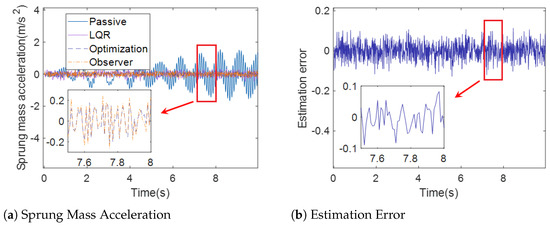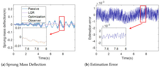 Figure 9a, Figure 10a and Figure 11a show the sprung mass acceleration, deflection, tire dynamic load of passive suspension, active suspension with traditional LQR control, active suspension with optimization LQR, and the full-order state observer under case 2. Figure 9b, Figure 10b and Figure 11b show the estimation error of the sprung mass acceleration, deflection, and tire dynamic load under case 2.
