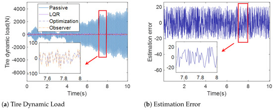 Figure 8a and Figure 11a show the tire dynamic load curve of the passive suspension, active suspension with traditional LQR control, active suspension with optimization LQR control, and the full-order state observer under case 1 and case 2. Moreover, it can be observed from Figure 8a and Figure 11a that the curve of the tire dynamic load under active suspension with the optimization LQR control is smaller than the curve of the passive suspension, active suspension with traditional LQR control, and active suspension, which illustrates that the capability of active suspension under optimization LQR control is more stable over the other methods.