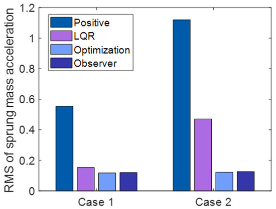 The detailed simulations results are presented in this section to verify the efficacy of the proposed control method. To illustrate the performance of the controller proposed in this paper, the simulation is carried out based on passive suspension, active suspension with traditional LQR control, active suspension with optimization LQR control, and the full-order state observer under case 1 and case 2. To evaluate the performance of suspension systems, the sprung mass acceleration, sprung mass deflection, and tire dynamic load are selected as evaluation indicators. The smaller the value of sprung mass acceleration and deflection, the better the performance of the ride comfort of the suspension system. The lower the value of the tire dynamic load, the better the performance of the road holding. The closer to zero the value of the observer estimation error is, the better the observer.
