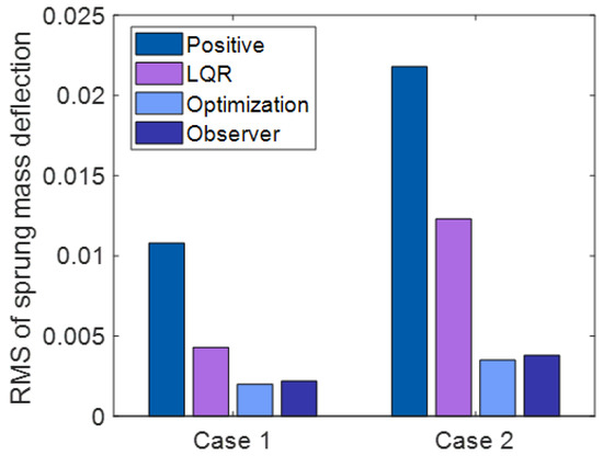 In Figure 7a and Figure 10a, the sprung mass deflection for passive suspension, active suspension with traditional LQR control, active suspension with optimization LQR control, and the full-order state observer under case 1 and case 2 are shown. It can be observed from Figure 7a and Figure 10a that the curve of the sprung mass deflection under active suspension with optimization LQR control is less pronounced than the curve of the passive suspension, active suspension with traditional LQR control, and active suspension, suggesting that the active suspension with the optimization LQR control performs better in terms of road holding than the other cases.
