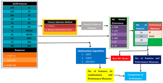 The main focus of the present work is to implement a suitable ML Model with an appropriate selection of features and their combinations to predict the crack dimensions more accurately as compared with the existing ANN model. Daniel et al. [12] from the given 22 GLCM features extracted from 115 MFL crack images. This has been carried out in four stages. In the first stage, the features are prioritized based on F Score (FS) and Mutual Information Score (MIS) values. L16 Taguchi orthogonal array design [25] has been constructed by considering feature selection methods (FSM), machine learning models (MLM), and number of features as parameters and R2 and RMSE values as response values. For each experiment, python codes are executed using the corresponding MLM, FSM, and target number of features as determined by the Taguchi array to determine the corresponding R2 and RMSE values for both training and test data sets. To analyze the effect of parameters and their interaction on the response values, an ANOVA test has been carried out in the third stage. The responses, namely R2 and RMSE values, for the training and testing data sets, are different for each experiment, which is similar to different alternatives among multiple design problems. To select the best design, these multiple responses are to be converted into a single value. Hence, in this work, a similarity-based multi-criterion ranking method called Deng’s method [26] is introduced to select the best ML model in the third stage. In the fourth stage, meta-heuristic algorithms, namely MFO, GWO, and DPGWO, a new variant of GWO proposed in this work, have been implemented to select the number of features and their combinations. Also, Performance indicators and Friedman’s test have been conducted in the fourth stage to prove the effectiveness of the DPGWO, along with statistical analysis to confirm the results. The proposed methodology is shown in Figure 1. The step-by-step algorithm of the proposed work is given below.